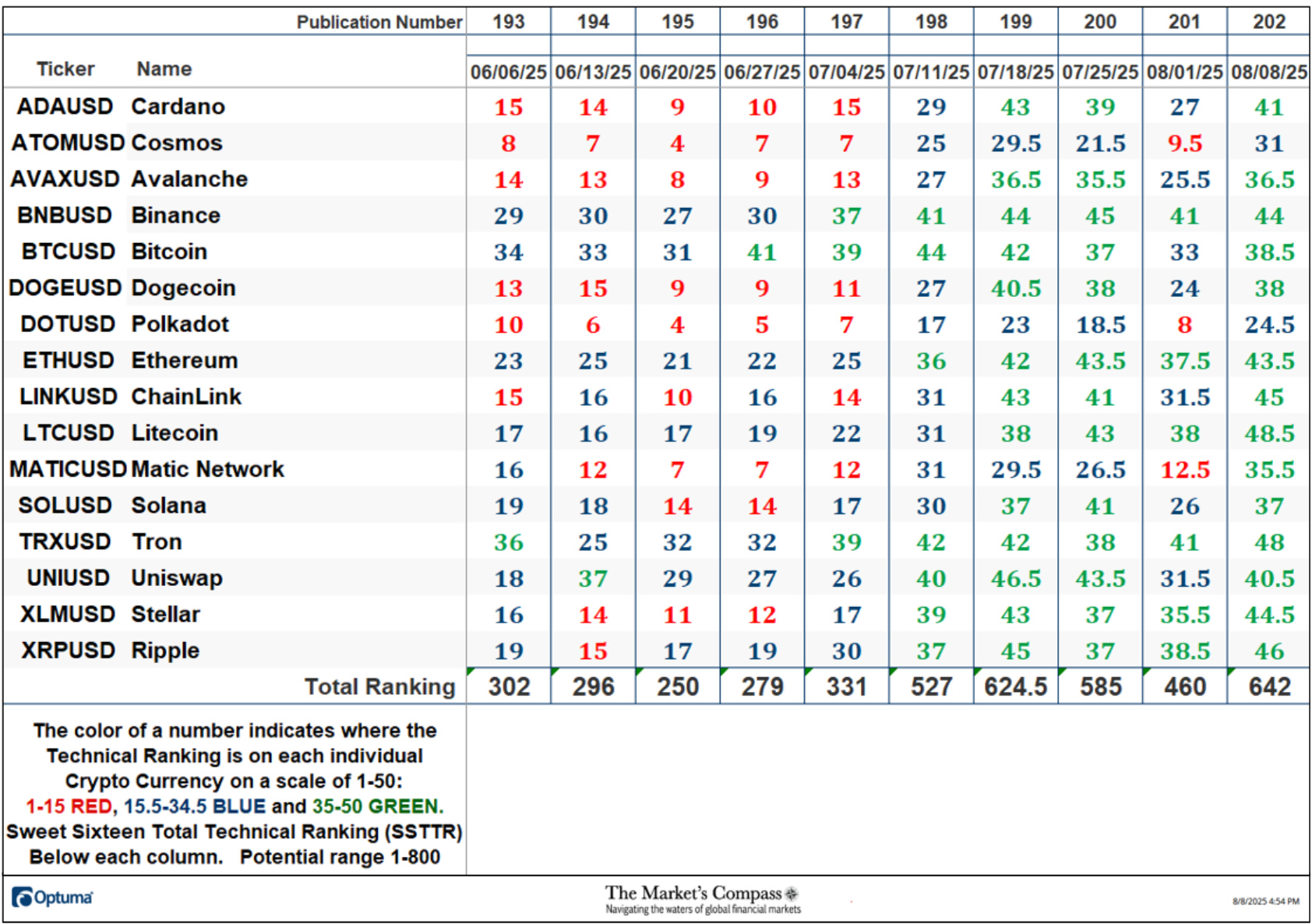 Welcome to this week’s publication of the Market’s Compass Crypto Sweet Sixteen Study #202. The Study tracks the technical condition of sixteen of the larger market cap cryptocurrencies. Every week* the Studies will highlight the technical changes of the 16 cryptocurrencies that I track as well as highlights on noteworthy moves in individual Cryptocurre…