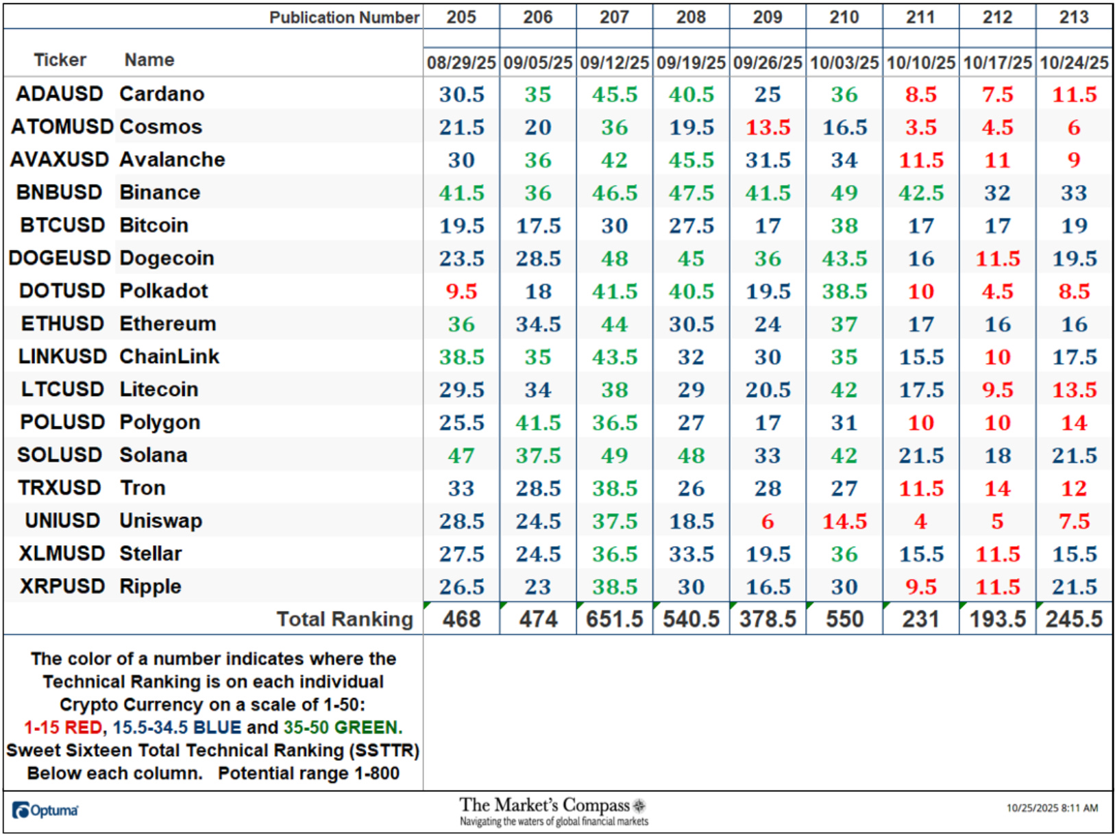 Welcome to this week’s publication of the Market’s Compass Crypto Sweet Sixteen Study #213. The Study tracks the technical condition of sixteen of the larger market cap cryptocurrencies. Every week the Studies will highlight the technical changes of the 16 cryptocurrencies that I track as well as highlights on noteworthy moves in individual Cryptocurren…